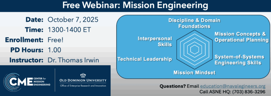 The ODU Center for Mission Engineering (CME)’s Executive Director, Dr. Thomas Irwin, had the pleasure of presenting a free webinar on Mission Engineering for the American Society of Naval Engineers (ASNE). During the session, Dr. Irwin covered Mission Engineering’s baselining core competencies, architectures, roles, and knowledge areas. He also outlined how the Mission Engineering framework […]